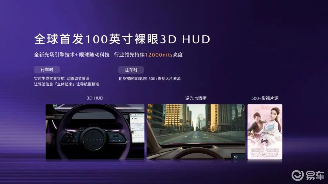更值得关注的是,EZ-60 全球首发 100 英寸裸眼 3D HUD,借助全新光场引擎技术与眼球随动科技,亮度可达 12000nits。行车时,SLHM 空间算法结合导航实现 “分层景深” 信息呈现,消除视觉延迟,降低分心风险;驻车时,可化身裸眼 3D 影院,线上影视库提供 500 余部 3D 片源,满足休闲娱乐需求。