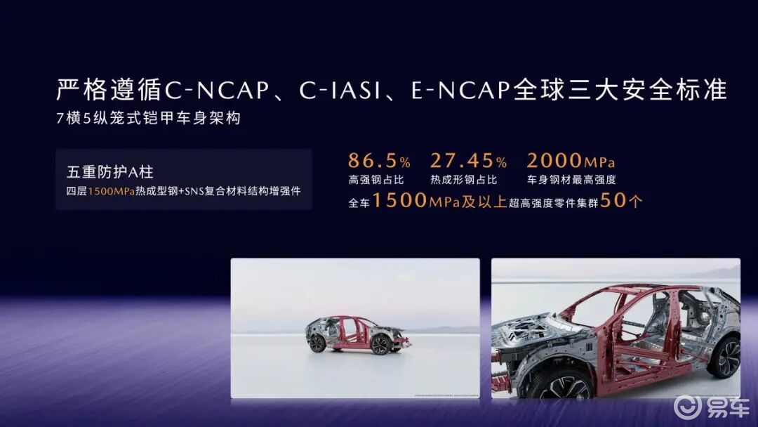 车身采用 7 横 5 纵笼式铠甲结构,高强钢占比 86.5%,热成形钢占比 27.45%,最高强度达 2000MPa,1500MPa 及以上超高强度零件集群共 50 个;A 柱采用五重防护结构,内外双层 1500MPa 热成型钢搭配腔体 SNS 复合材料,抗弯性能提升 44%。