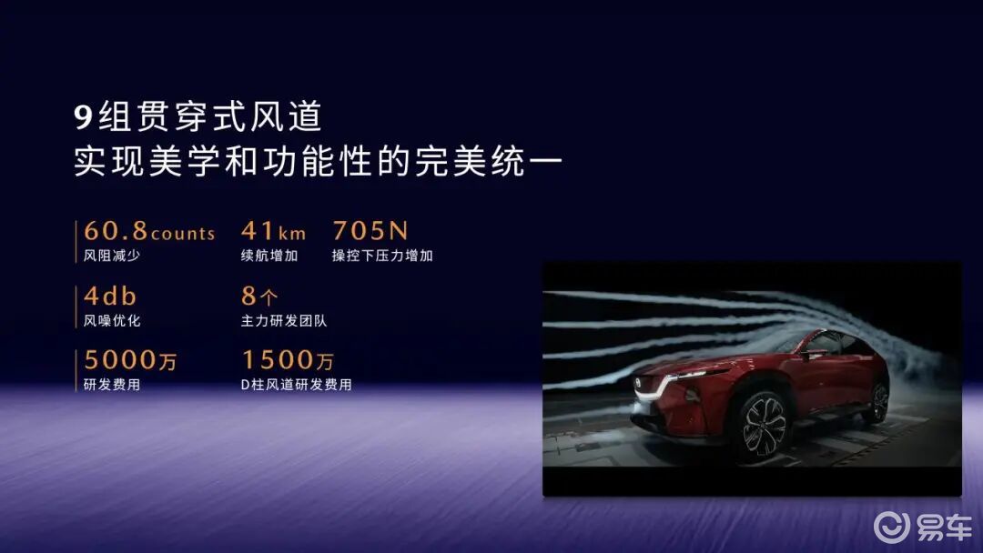值得一提的是,EZ-60 创新采用同级首创的 9 组贯穿式风道与 7 组空气动力学组件,可减少风阻 60.8 counts,使 CLTC 续航提升 41km,节能效果显著;高速行驶时,后轴能获得最高 705N 的稳定下压力,提升行驶稳定性;同时,多风道设计还能优化风噪 4dB(A),为车内营造静谧空间。