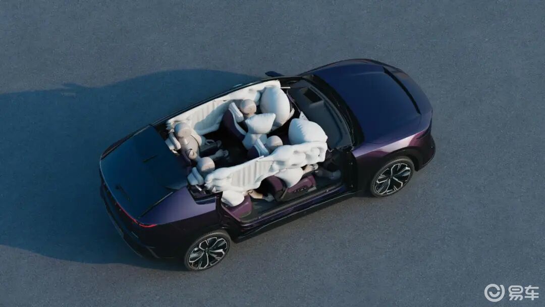 全系标配 9 个安全气囊,总容积 370L,保护面积 26500cm²;双腔中央气囊可防止前排乘员侧面撞击时二次伤害,2 米超长侧气帘从 A 柱覆盖至 C 柱,副驾飞跃式气囊能在爆炸瞬间避开大屏,保障乘员安全。