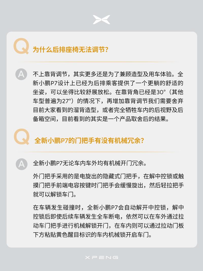 其中关于全新小鹏P7的门把手有没有机械冗余?小鹏汽车官方回复:无论车内外均有机械开门冗余。外门把手采用的是电旋出的隐藏式门把手,在解中控锁或触摸门把手前端电容按键时门把手会缓慢旋出,然后轻拉把手就可以解锁车门。在车辆发生碰撞时,全新小鹏P7会自动解开中控锁,解中控锁后即使后续车辆发生全车断电,依然可以在车外通过拉动车门把手进行机械解锁开门,在车内则可以通过拉动门板下方粘贴黄色醒目标识的车内机械锁开启车门。