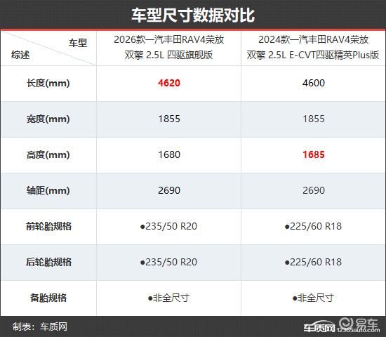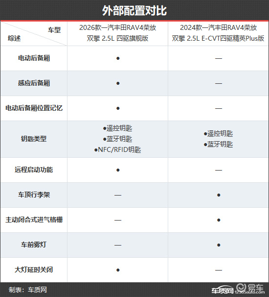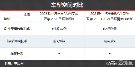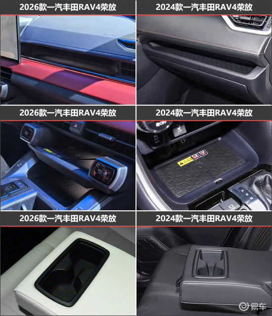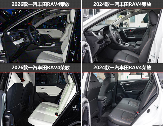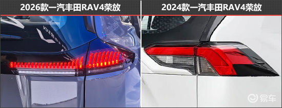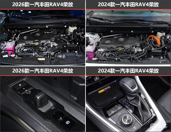 2026款一汽丰田RAV4荣放依旧定位为紧凑型SUV,共推出6款配置车型,动力方面提供2.0L燃油版、2.0L混动版以及2.5L混动版本可选;相比之下,2024款一汽丰田RAV4荣放的车型数量为7款,目前均已处于停产在售阶段。本次对比选择的车型均为顶配版本,以便能够更加直观地看出在配置层面的具体差异。