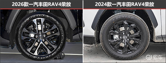 新款RAV4荣放的侧面线条相对柔和一些,除此之外,无论是黑色轮眉还车门样式,均与老款车型保持高度一致。尺寸方面,新老款车型的差别也并不大,只是车身长度和高度有细微变化。新款RAV4荣放的轮毂升级为20英寸,搭配撞色设计,相较老款车型明显更具视觉冲击力。