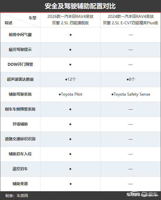 驾驶辅助配置方面,新款RAV4荣放换装了最新版本的Toyota Pilot系统,拥有12个超声波雷达,支持倒车车侧预警系统、并线辅助、道路交通标识识别以及辅助变道等主流功能。相较老款车型,确实算是“跨时代”的进步。