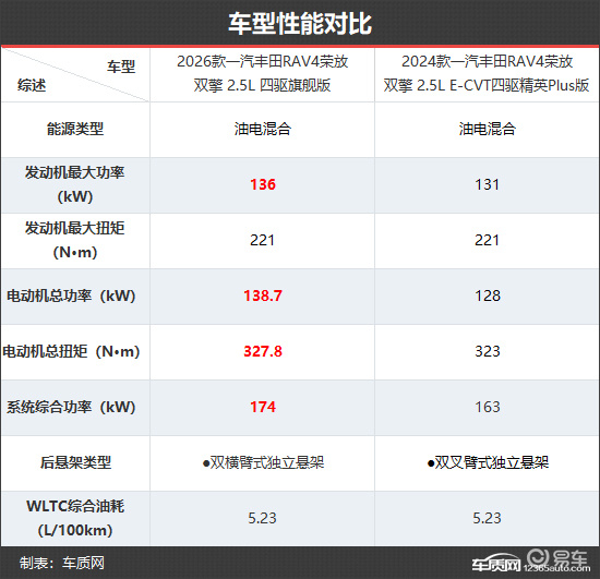 动力方面,新款RAV4荣放在保留2.0L汽油发动机和2.5L混动系统的基础上,还新增2.0L混动版本,进一步丰富了消费者的选择。本次对比的顶配车型均为混动版本,由2.5L自然吸气发动机和前后双电机组成。虽然新款车型的动力参数有所提升,但是官方公布的WLTC综合油耗仍为5.23L/100km,与老款车型保持一致。