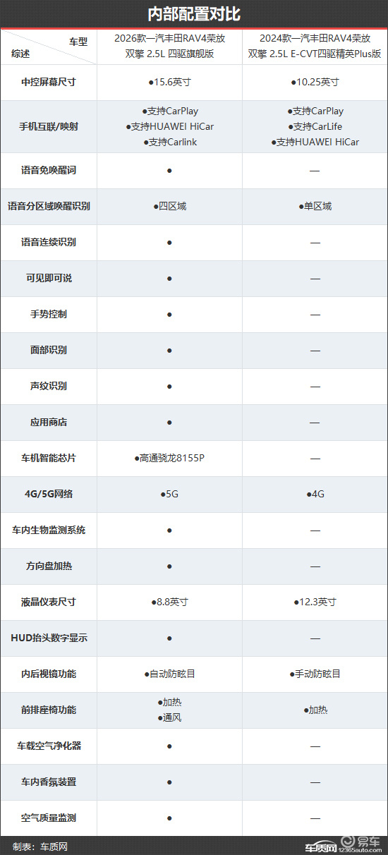 内部配置方面,新款RAV4荣放的智能化表现进步明显,不仅搭载高通骁龙8155P芯片,新增语音连续识别、可见即可说、手势控制以及面部识别等功能,而且还配备了例如方向盘加热和前排座椅通风等舒适性配置。相比之下,老款车型在这些方面的表现确实已经明显滞后。