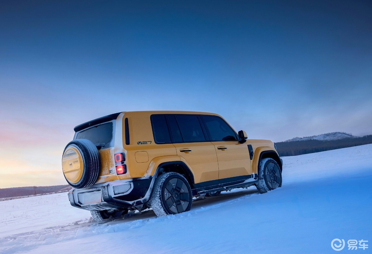 在外观设计上,iCAR V27延续了方盒子造型,整体风格偏硬朗。方正的身型搭配时尚硬派的前脸,粗犷的前包围与圆形大灯组相得益彰,展现出强烈的力量感和复古感。车身侧面线条硬朗笔直,车尾搭载与车身同色的“小书包”和可选的外挂式备胎,进一步强化了其越野气息。