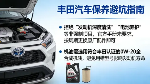 核心避坑要点:一是拒绝“发动机深度清洗”“电池养护”等非强制项目,官方手册未要求,按周期更换原厂配件即可;二是机油需选用符合丰田认证的0W-20全合成机油,避免用错型号影响发动机寿命;三是双擎版无需频繁充电,日常通勤无需刻意维护电池,遵循1万公里保养周期即可,无需提前养护。