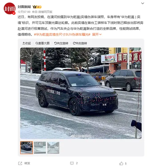 IT之家 1 月 16 日消息,东风与华为乾崑联合打造的全新品牌奕境汽车首款车型谍照曝光,测试车辆正于漠河进行极寒测试,全面验证车辆在极端环境下的可靠性。