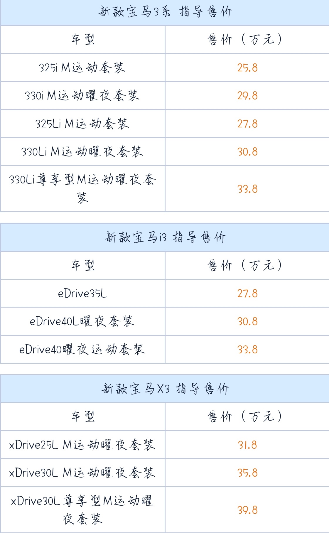 先说说大家最关心的价格。新款3系起售价降到了25.8万,比老款便宜了不少,这个价格已经快摸到普通合资B级车的上限了。电动版的i3起售27.8万,SUV车型X3则是31.8万起,三款车都维持了原来的车型数量,没有增减配置版本,只是统一下调了指导价。