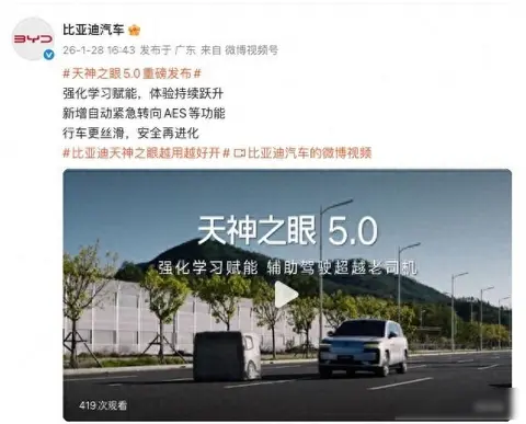 2026年1月28日,比亚迪推出“天神之眼5.0”,这个系统不是简单增加几个功能,而是换了一种思路,让系统自己学习驾驶方式,以前的辅助驾驶靠人工制定规则、标注数据,现在系统能从真实道路上获取数据,一边开车一边调整,像老司机一样越开越熟练,这种变化很大,不是升级,是换了脑子。