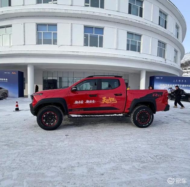 车身侧面来看,新车采用了双排座车厢设计,在侧裙处拥有专属拉花,配合33英寸越野轮胎(17英寸轮圈)以及黑色轮眉,展现硬汉气质。尾部方面,该车货箱可以支持分段式打开,货箱上方并未配备龙门架,不过后包围处则可以看到拖车方口,具备合法上路的拖拽资质。