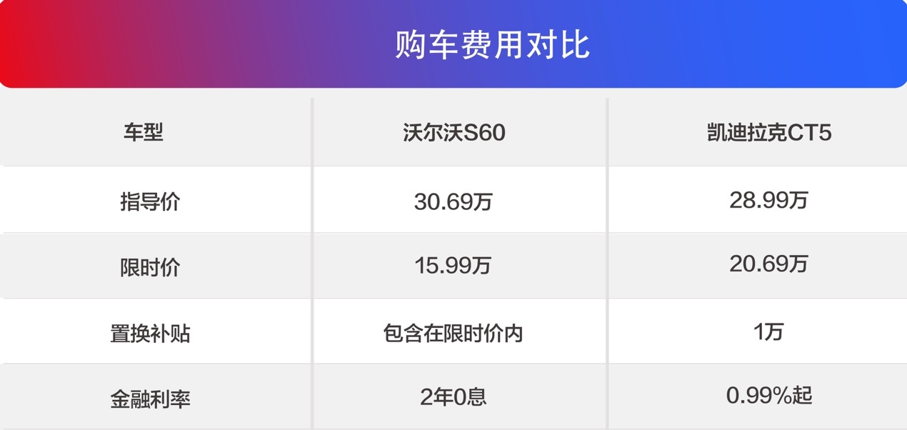 今天咱们以沃尔沃S60 2026款 B4智逸豪华版,指导价30.69万和凯迪拉克CT5 28T 城市风尚版,指导价28.99万为例。单看指导价,S60的价格更高,要比CT5贵了1.7万元。但是现在S60在2月有限时置换补贴价,只要15.99万起,你没看错,这真的是一辆豪华品牌中型车的价格。并且还有0首付起2年0息的金融政策,进一步降低了购车压力。而凯迪拉克CT5限时一口价20.69万,置换补贴10000元,咱们就按19.69万元算,那也比S60贵了3.7万元。这些钱不管是带着全家出去旅游还是投资最近热度非常高的黄金,这可是实打实的真金白银啊。
