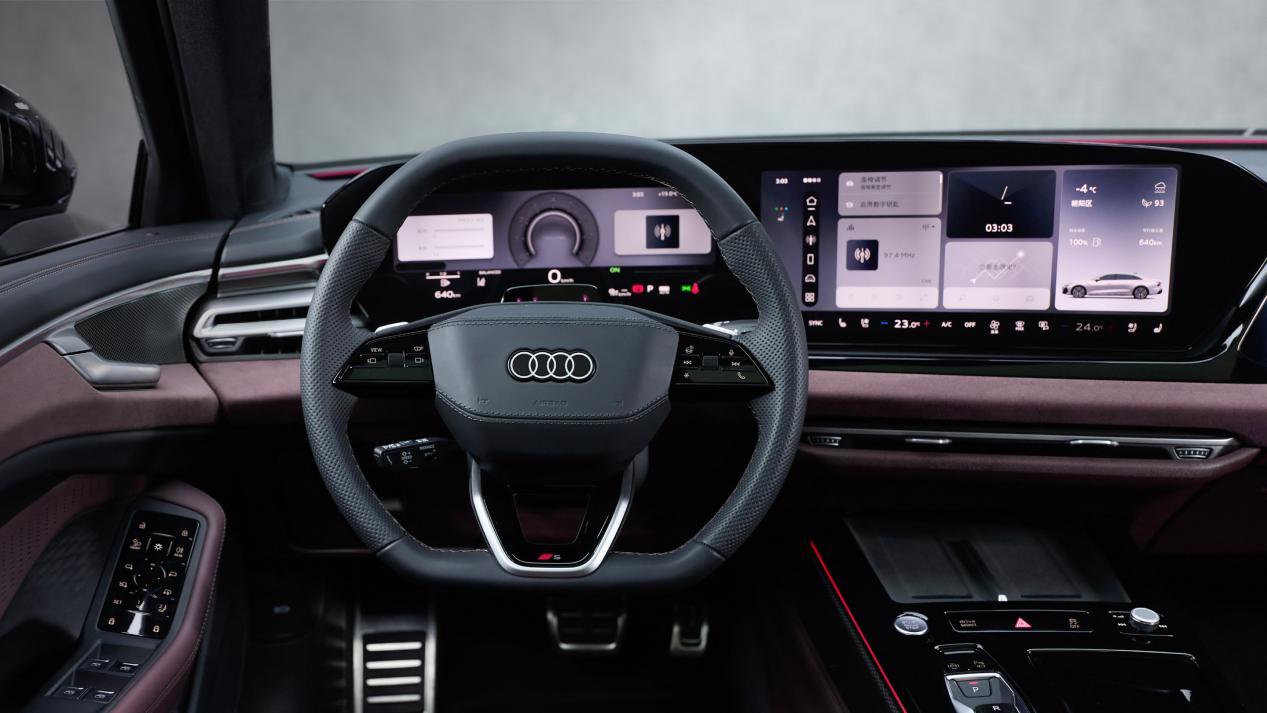 内饰方面,全新A6L采用奥迪最新家族式设计。配备由11.9英寸仪表屏+14.5英寸中控屏组成的悬浮式弧面双联屏,副驾区域提供独立设计的嵌入式10.9英寸副驾娱乐屏,部分车型还将搭载W-HUD抬头显示功能。车辆方向盘有两种选择,偏运动的平底式结构,或者更传统的四辐式圆形结构,中央扶手区配备少量按键和滑块式电子换挡机构,显得十分简洁。