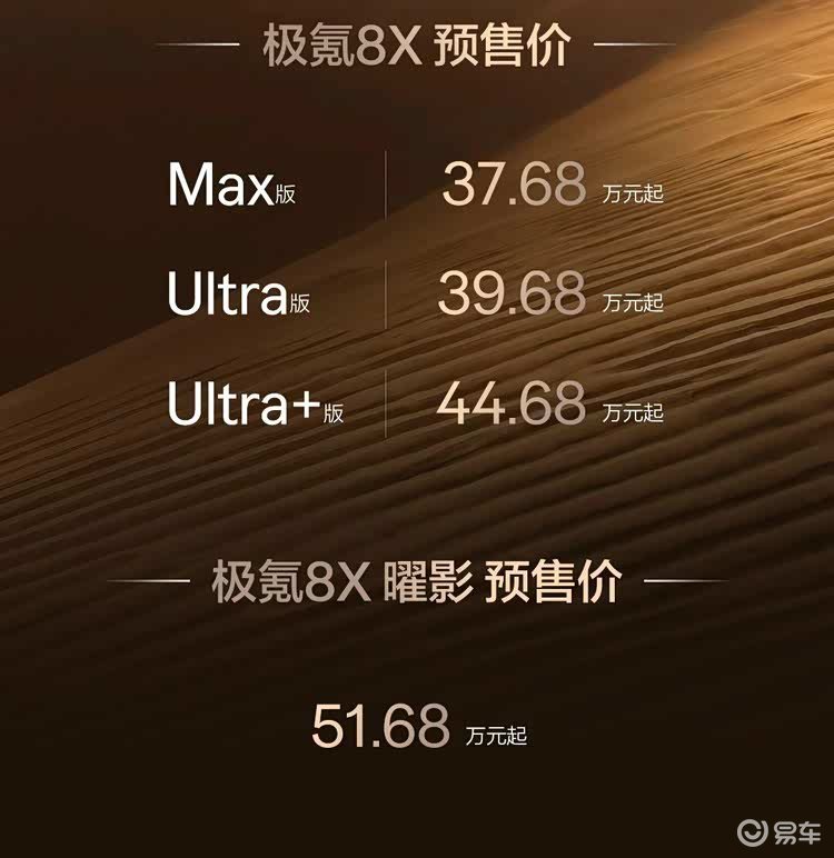 预售价格出来了:极氪8X Max版37.68万元起,Ultra版39.68万元起,Ultra+版44.68万元起,曜影版51.68万元起。(数据来源:极氪3月16日发布会)