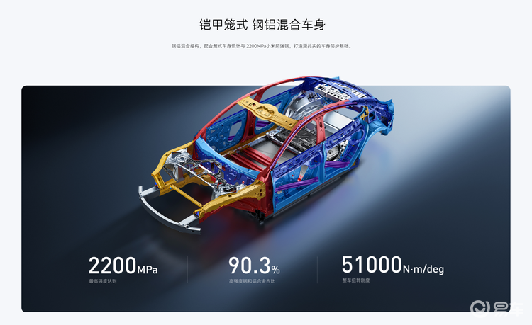 气囊也从7个升级到9个,新增两个后排侧气囊。车身用了2200MPa超强钢,电池包底部加了1500MPa防刮横梁,还有防弹涂层。