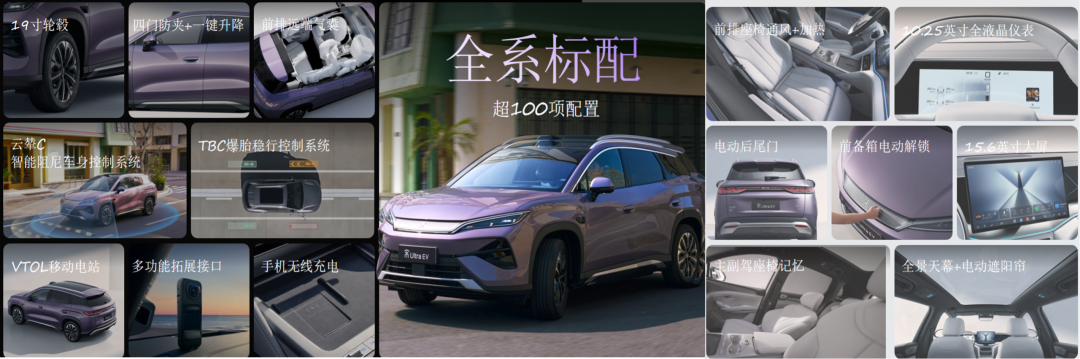 空间拓展性更是宋Ultra EV的核心亮点,730L后备箱可轻松容纳6个20寸行李箱加1个婴儿车,150L前备箱提供额外独立收纳空间,主副驾座椅可同步放倒,秒变“大床模式”,搭配可冷热调节的智能冷暖箱,无论是露营小憩还是长途旅行,都能从容应对、倍感舒适。此外,新车全系标配电动后尾门、前备箱电动解锁、全景天幕+电动遮阳帘、四门防夹+一键升降等超100项配置,真正实现“起步即满配”,全方位提升出行品质与便捷度。